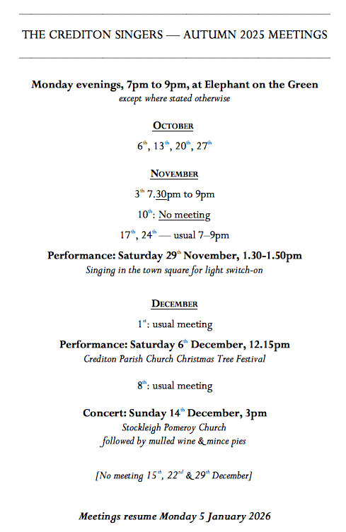 Based in Crediton, in mid Devon, and directed by local singer Philip Lancaster, we meet on Monday evenings at Crediton’s ‘Elephant on the Green’ on St. Lawrence Green, sharing a diverse range of music, and just enjoying the sing! Whether you are someone with some experience of singing, or one that just likes to sing in the shower and hasn't dared to make the brave step to sing with others, you can be assured of a friendly welcome! No prior experience is necessary, and there's no need to be able to read music.